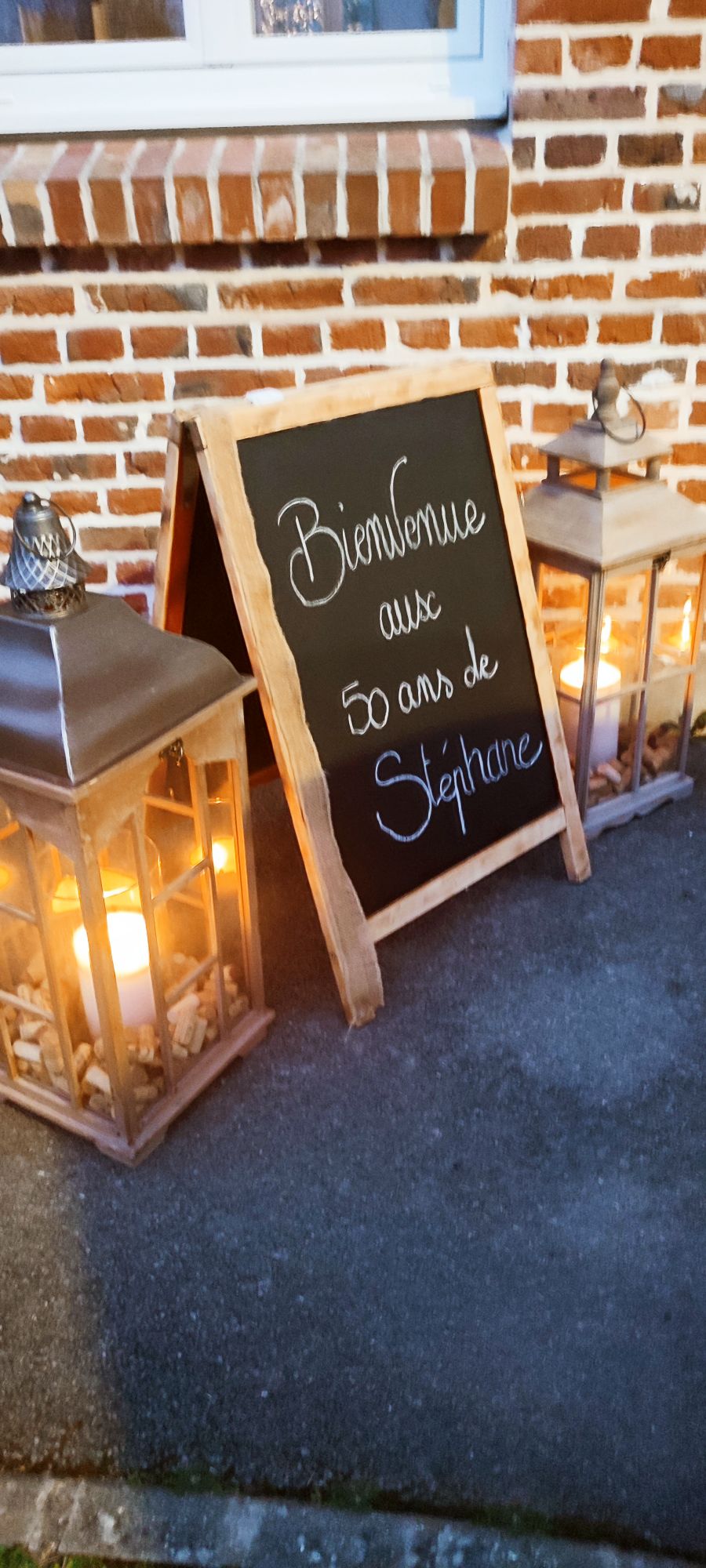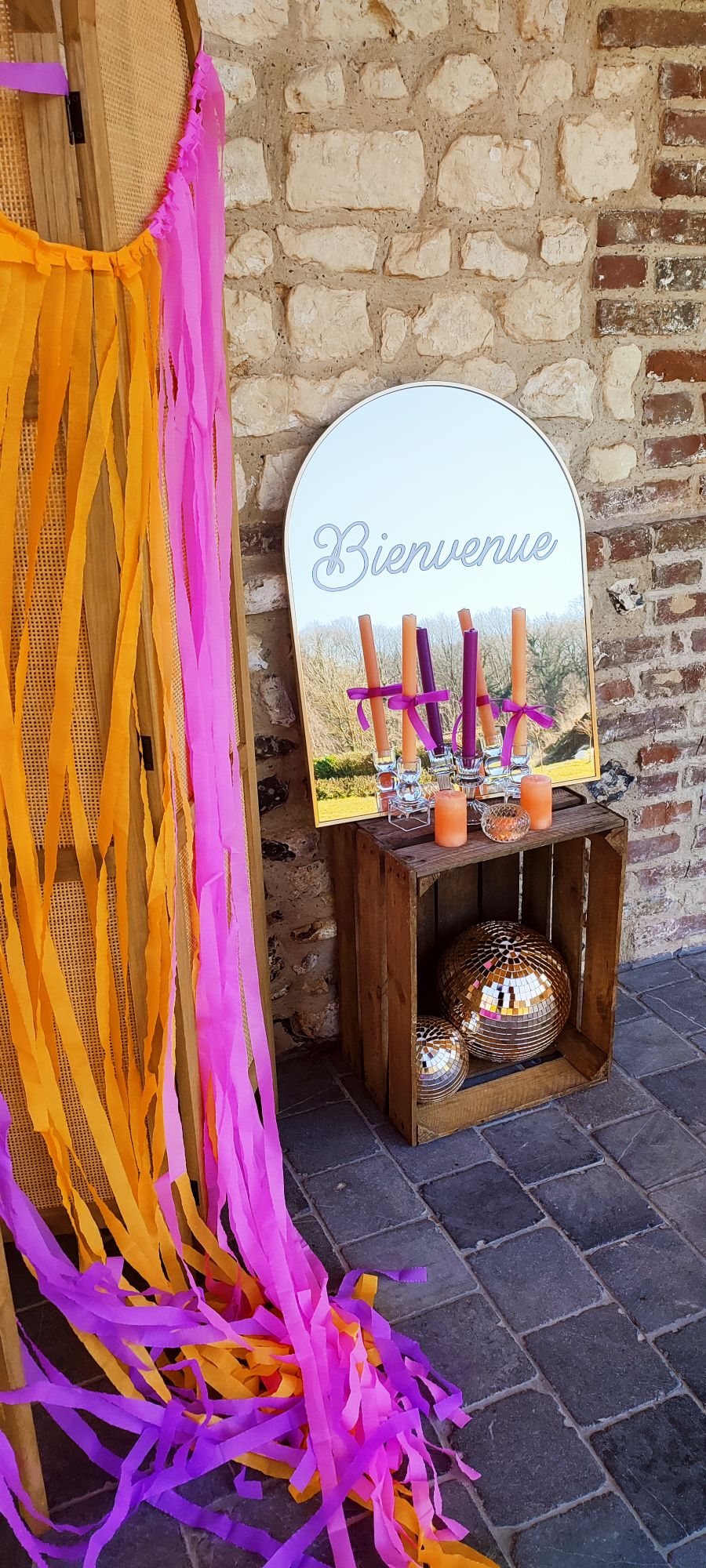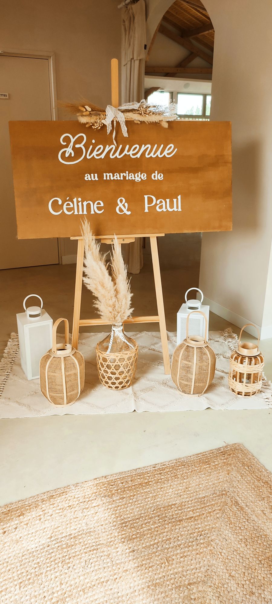 Elle peut s’accompagner d’un panneau de bienvenue (support bois, plexi ou miroir) orné d’élément de décoration.