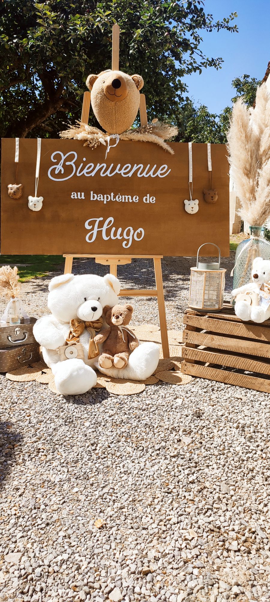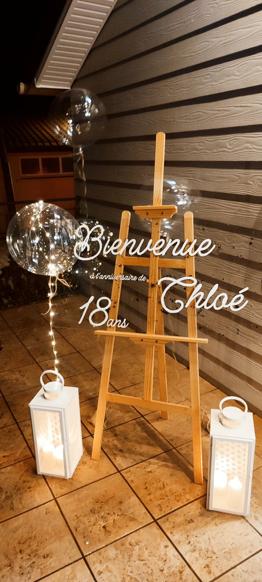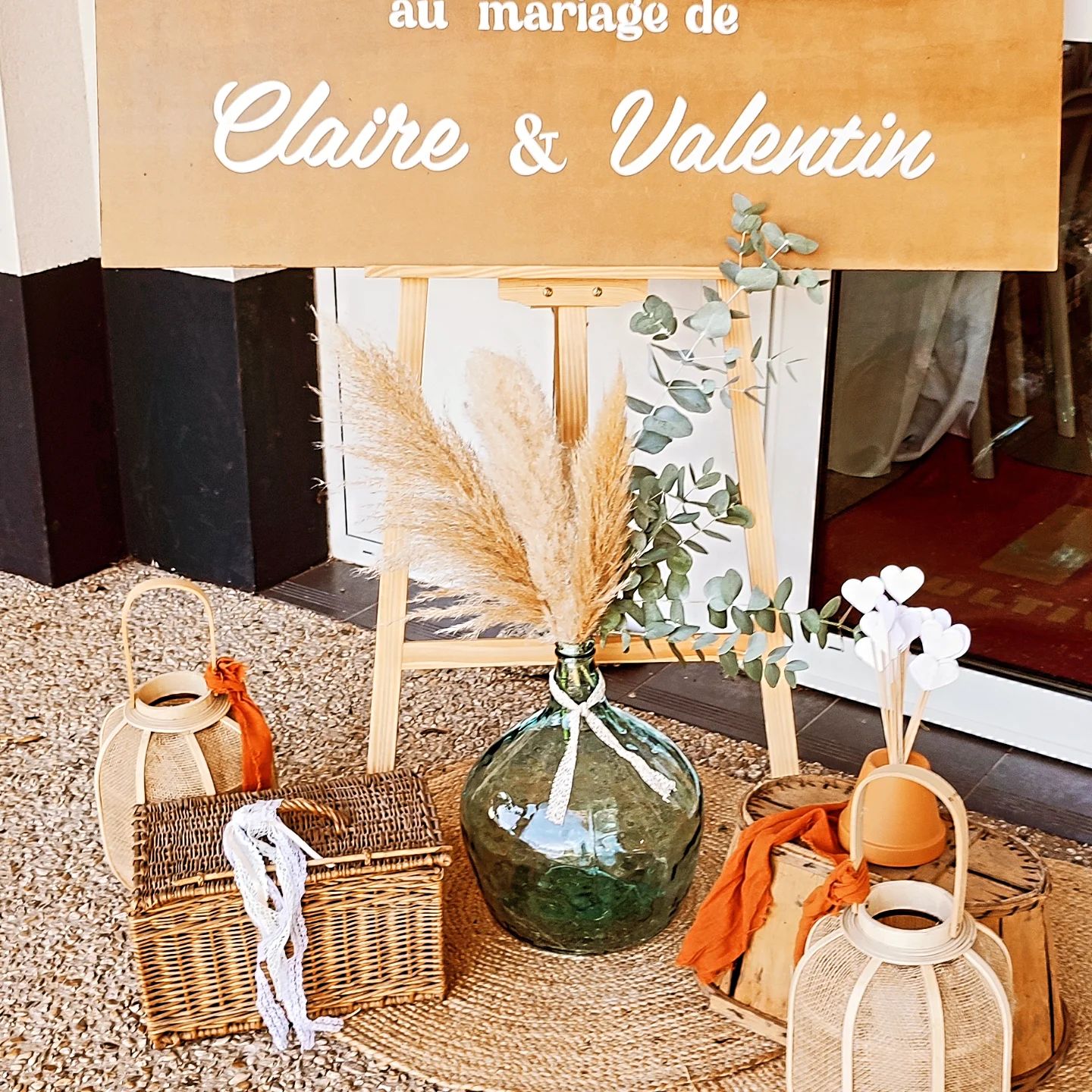 Elle peut s’accompagner d’un panneau de bienvenue (support bois, plexi ou miroir) orné d’élément de décoration.