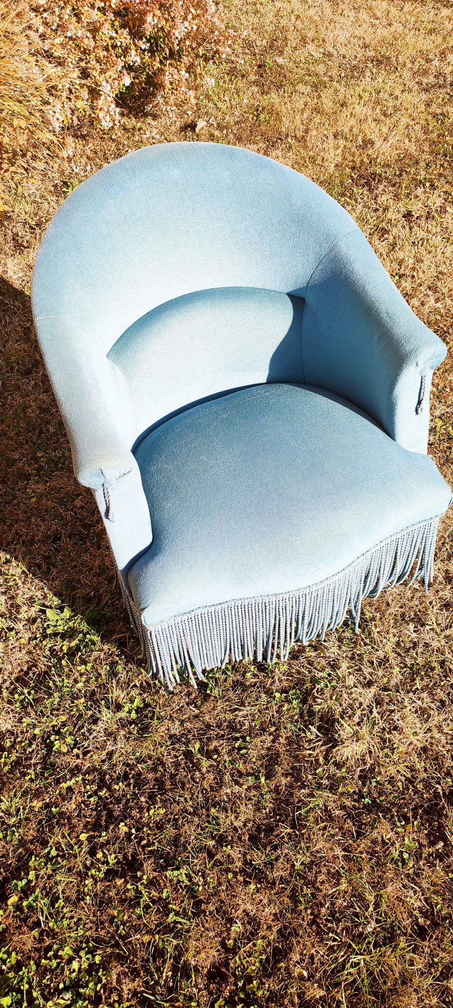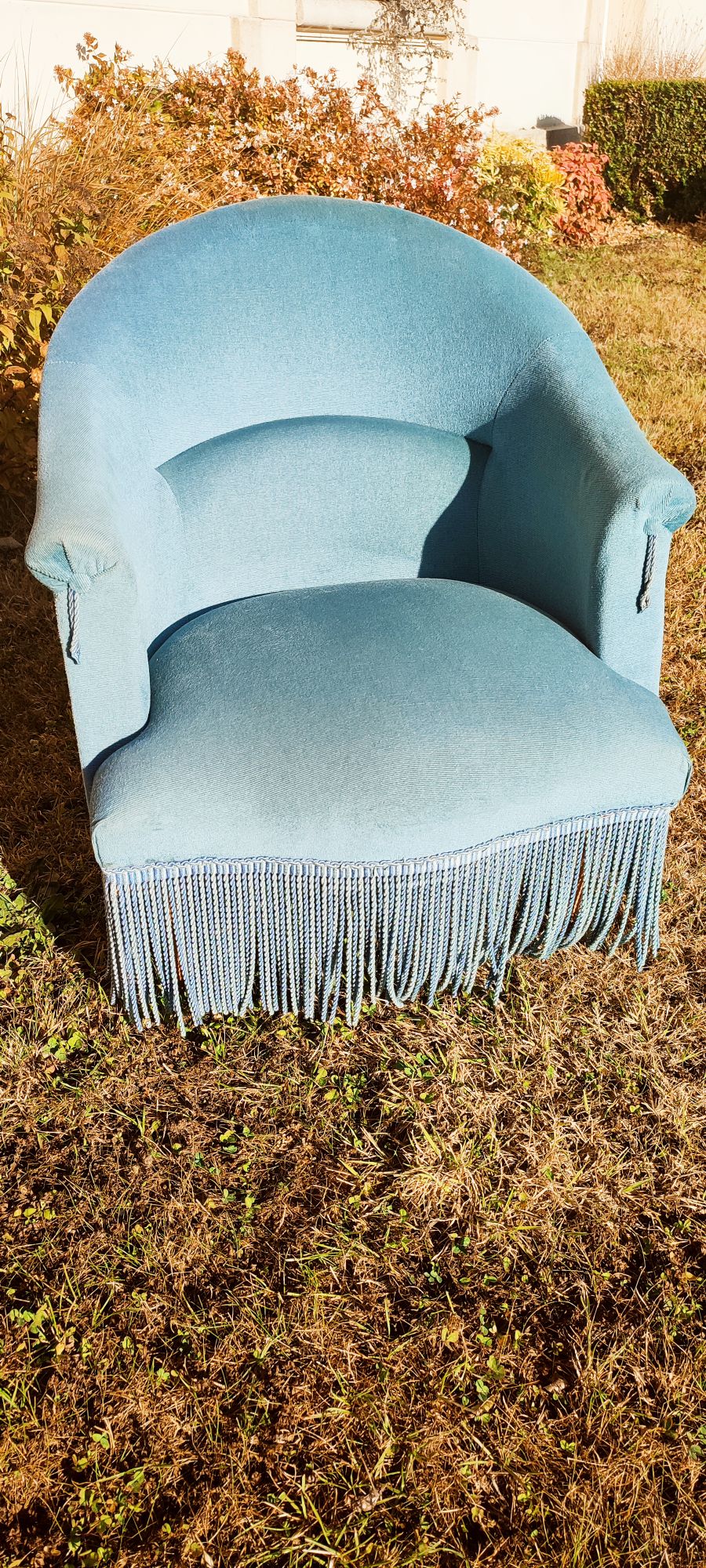 Style crapaud, le fauteuil « Jean » est en velours bleu.